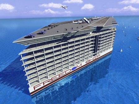 The Freedom Ship as conceived by its father Norman Nixon must be a place for living, retiring, tourism and entertainment floating around the globe at low speed. To be honest it looks more like floating city than an ordinary ship. And because there would be no big enough ports to welcome this giant, the travelers will use the ship’s airport and ferry port to go back and forth when they decide to feel solid ground beneath their feet. If they decide not to leave their ocean city, there won’t be any reason to do the opposite. Everything that usually they have at hand on the land will be available at sea. That’s the strongest point of the Freedom Ship concept. At the same time it may become one of its weakest points.