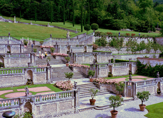 Located at Casalzuigno in the Italian province of Varese, Villa Della Porta Bozzolo was built by a member of the Della Porta family. Created in the sixteenth-century as a country villa, the Villa later became a noble company residence. At the end of the 17th century the villa experienced one of its most important transformations on the initiative of Gian Angelo Della Porta III on the occasion of his marriage to Isabella, daughter of Count Giorgio Giulini. The impressive baroque garden was made in the early eighteenth century added with stairs, terraces, fountains, water features decorated with frescoes. The Villa Della Porta Bozzolo is among the most majestic creations of green architecture surviving in Italy today.