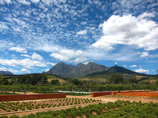Babylonstoren is a Cape Dutch farm with vineyards and orchards surrounded by the dramatic mountains of the Drakenstein Valley. It has an exceptionally well–preserved werf dating from 1690. A fruit and vegetable garden of botanical diversity supplies a remarkable restaurant. Guests staying at an exclusive farm hotel enjoy access to the entire farm, plus facilities like a spa and gym. The aim is to have guests feel more comfortable, more alive among warm smiles and the simple daily rhythm of the farm.