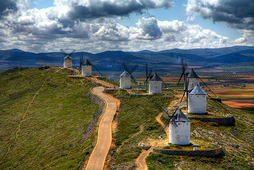 Spain is well served with windmills, both on the mainland, and also on the various islands of the Balearics, and the Canaries. These windmills inspired Miguel de Cervantes to create the famous episode of the battle against the giants in his work “Don Quixote” and became famous in the 16th century (when Don Quixote was first published). Consuegra is a municipality located in a province of Toledo, Castilla-La Mancha. The best examples of restored Spanish windmills can be found in this province.