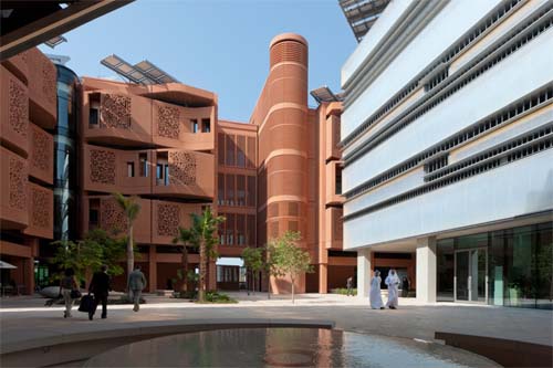 The Foster + Partners have completed the first of a cluster of solar powered buildings in Masdar city, Abu Dhabi in the United Arab Emirates. The Masdar Institute is a graduate level, research-oriented university which is focused on option energy, sustainability, and the environment, that will generate more solar energy than it consumes. The building features a perforated frontage made of glass-reinforced concrete colored with local sand and detailed with patterns found in traditional Islamic architecture.