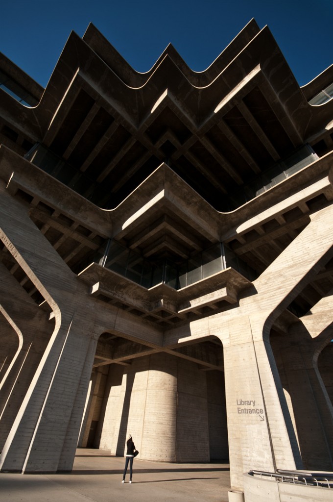The Geisel Library is the main library building on the University of California, San Diego campus and is open to non-students. Being located so close Hollywood it isn’t surprising that the Geisel has been the location of several movie and television shoots. William Pereira designed the Geisel Library in the late 1960s, at the end of a decade that saw a wave of supposedly futuristic architecture sweep southern California. Originally named The University Library Building, On December 1, 1995 it was renamed Geisel Library in honor of Audrey and Theodor Geisel (Dr. Seuss) for the generous contributions.