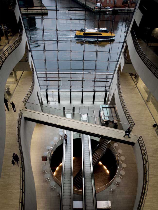 Built in 1999, the “Black Diamond” is a modern extension to the Royal Danish Library which is the largest library in the Nordic countries. The old library dates from 1906 and was designed by architect Hans J. Holm. Located at the waterfront of Copenhagen, this new library building is designed by the Danish architects Schmidt, Hammer and Lassen. Contains a library, concert hall, bookshop, café, exhibition space and restaurant, it is the first in a series of large-scale cultural buildings along Copenhagen’s waterfront.